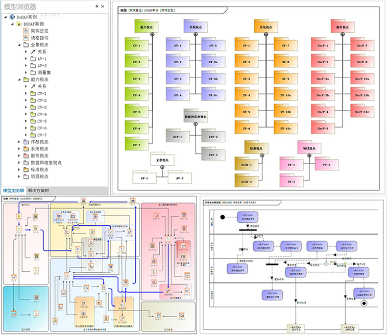 - 可建立體系的全景、能力、操作(作戰(zhàn))、服務(wù)、系統(tǒng)、數(shù)據(jù)和信息、項目、標準、安全等視點(視角)的各種視圖。能夠基于作戰(zhàn)活動視圖或系統(tǒng)活動視圖等進行仿真,完成體系需求論證、體系架構(gòu)設(shè)計、作戰(zhàn)過程推演等工作。